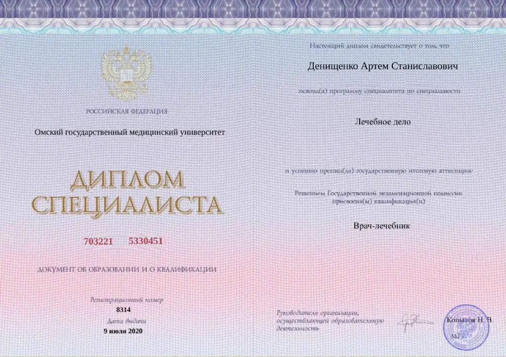 • 2020 г. – Базовое образование: Омский государственный медицинский университет (лечебное дело);