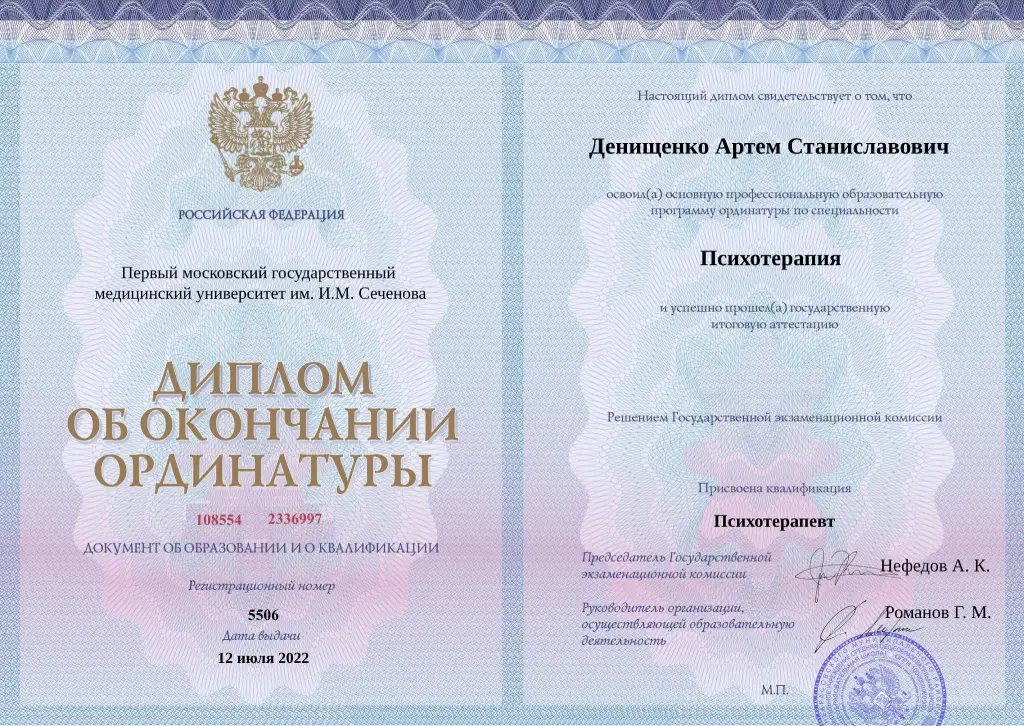 • 2022 г. – Ординатура: Первый московский государственный медицинский университет им. И.М. Сеченова (психотерапия).